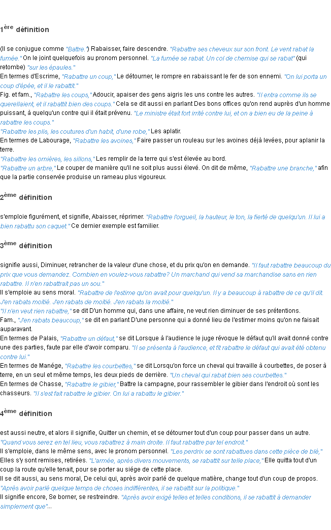 Définition du mot « rabattre » par l’équipe de la-definition.fr (édition de 2011).Merci à Dorothée et Joséphine pour la numérisation du mot rabattre.