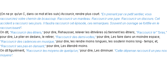 Ancienne signification éditée en 1835 pour le terme « raccourcir » par l’Académie Française.
