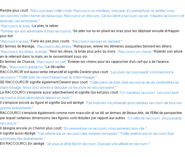 Signification parue en 2009 (source la-definition.fr).Merci à Hilaire et éliane pour la numérisation du mot raccourcir.