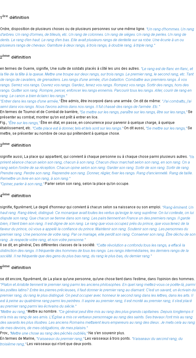 Signification éditée en 2010 par l’équipe de la-definition.fr.Merci à Jérôme et Honoré pour la numérisation du mot rang.