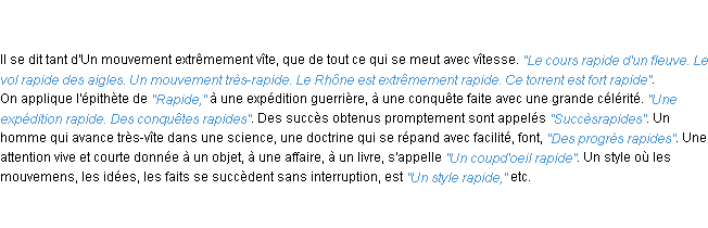 Définition du mot « rapide » par l’équipe de la-definition.fr (édition de 2011).Merci à Michèle et Tatienne pour la numérisation du mot rapide.