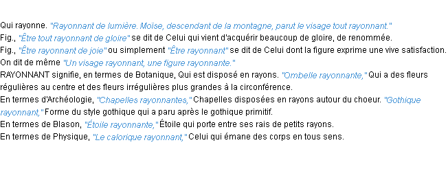 Signification parue en 2009 (source la-definition.fr).Merci à Gilles et élodie pour la numérisation du mot rayonnant.