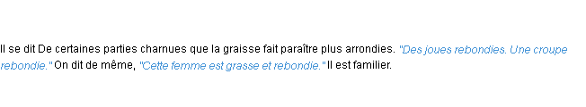 Signification éditée en 2008 pour le terme « rebondi » par l’équipe de wiktionary France.Merci à Clémence et Gisèle pour la numérisation du mot rebondi.