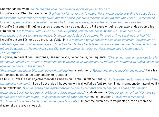 Ancienne définition académique pour le terme « rechercher » (parue en 1798).