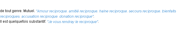 Ancienne signification parue en 1694 dans dictionnaire de l’Académie Française.Merci à Léon et Marguerite pour la numérisation du mot reciproque.