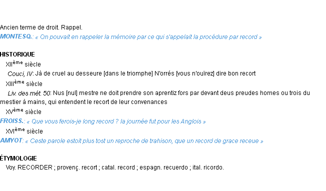 Signification éditée en 1876 pour le terme « record » par Emile Littré.Merci à Gautier et Léon pour la numérisation du mot record.