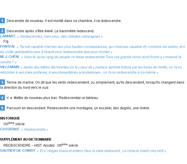 Signification du terme « redescendre », parution de 1876 (dictionnaire le Littré).Merci à Apolline et Josette pour la numérisation du mot redescendre.