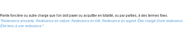 Signification éditée en 2010 par l’équipe de la-definition.fr.Merci à Clément et Sylvie pour la numérisation du mot redevance.