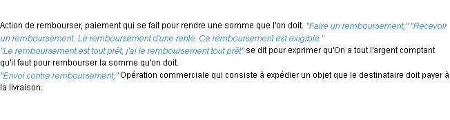 Définition de l’équipe de la-definition.fr (édition de 2009) pour le mot « remboursement ».Merci à Gaétan et édouard pour la numérisation du mot remboursement.