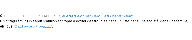 Signification éditée en 2010 par l’équipe de la-definition.fr.Merci à Papillion et Marie pour la numérisation du mot remuant.