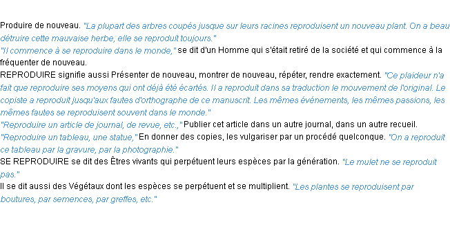 Définition de l’équipe de la-definition.fr (édition de 2009) pour le mot « reproduire ».Merci à Papillion et Aurélie pour la numérisation du mot reproduire.