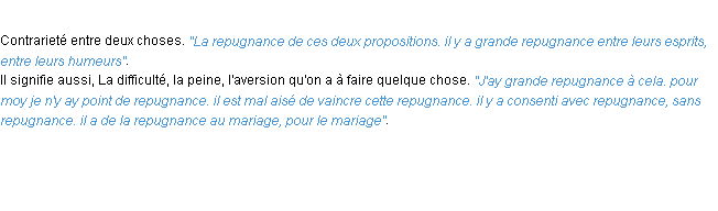 Ancienne signification issue du dico de l’Académie Française, parue en 1694.Merci à Hercule et Cyrille pour la numérisation du mot repugnance.