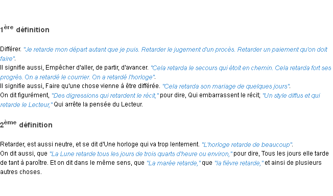 Signification éditée en 2010 par l’équipe de la-definition.fr.Merci à éloise et Céleste pour la numérisation du mot retarder.