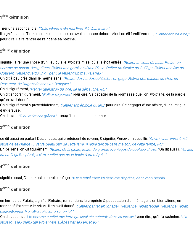 Ancienne définition « retirer » du dictionnaire académique Français, parution de l’année 1835.