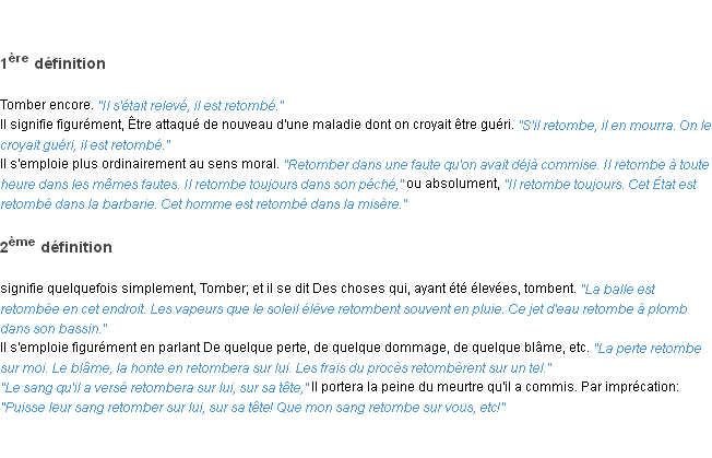 Définition du mot « retomber » par l’équipe de la-definition.fr (édition de 2011).Merci à Claire et Suzette pour la numérisation du mot retomber.