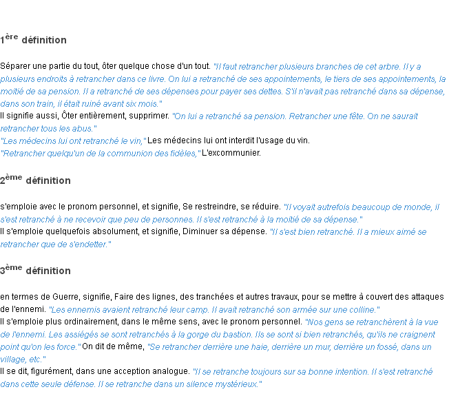 Définition de l’équipe de la-definition.fr (édition de 2009) pour le mot « retrancher ».Merci à Patrice et Marielle pour la numérisation du mot retrancher.