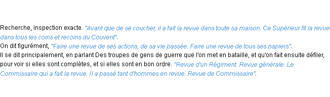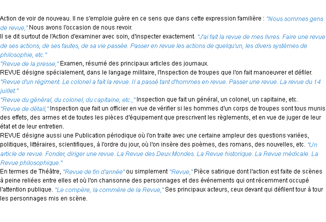 Ancienne signification du terme « revue », parution de 1835, dictionnaire académique Français.