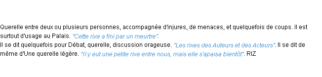 Définition développée dans dictionnaire d’Emile Littré (ancienne édition de 1876).Merci à Pénélope et Ozanne pour la numérisation du mot rixe.