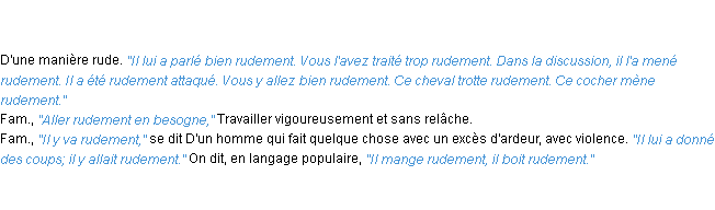 Ancienne signification éditée en 17962 pour le terme « rudement » par l’Académie Française.Merci à Mélissa et Guillaume pour la numérisation du mot rudement.
