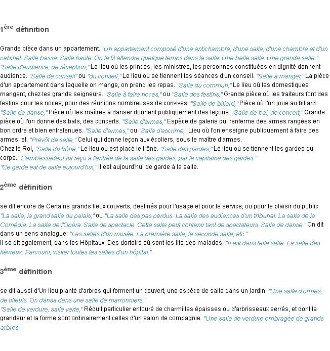 Signification éditée en 2010 par l’équipe de la-definition.fr.Merci à Benoite et Franck pour la numérisation du mot salle.