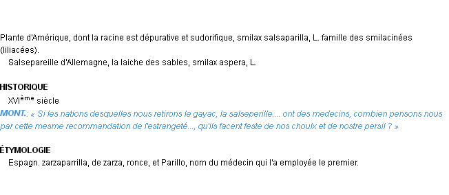 Définition d’Emile Littré (édition de 1876) pour le mot « salsepareille ».Merci à Régis et Marguerite pour la numérisation du mot salsepareille.