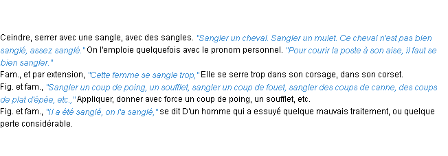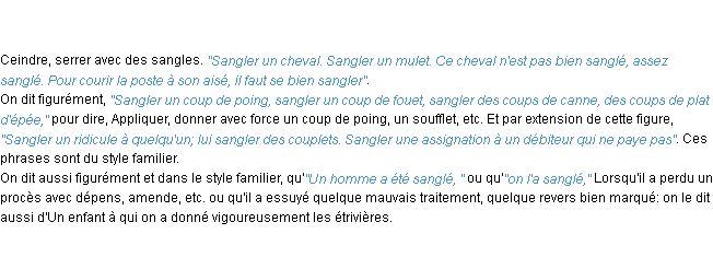 Ancienne signification développée en 17962 par l’académie Française (ACAD - 17962).Merci à Gaston et Léon pour la numérisation du mot sangler.