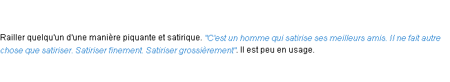 Définition développée dans dictionnaire d’Emile Littré (ancienne édition de 1876).Merci à éliane et Franck pour la numérisation du mot satiriser.