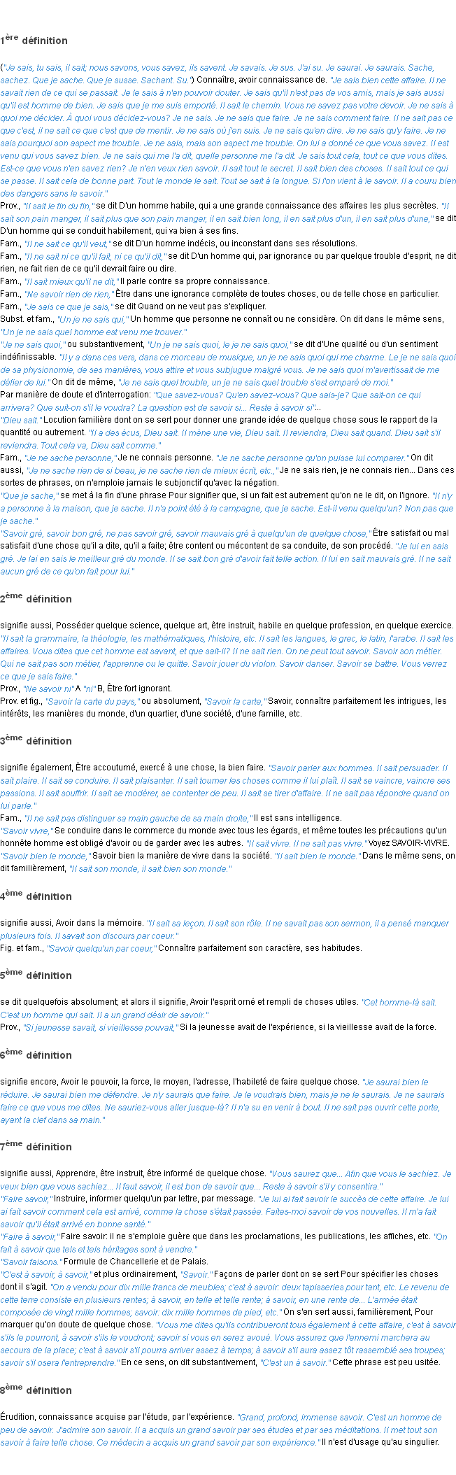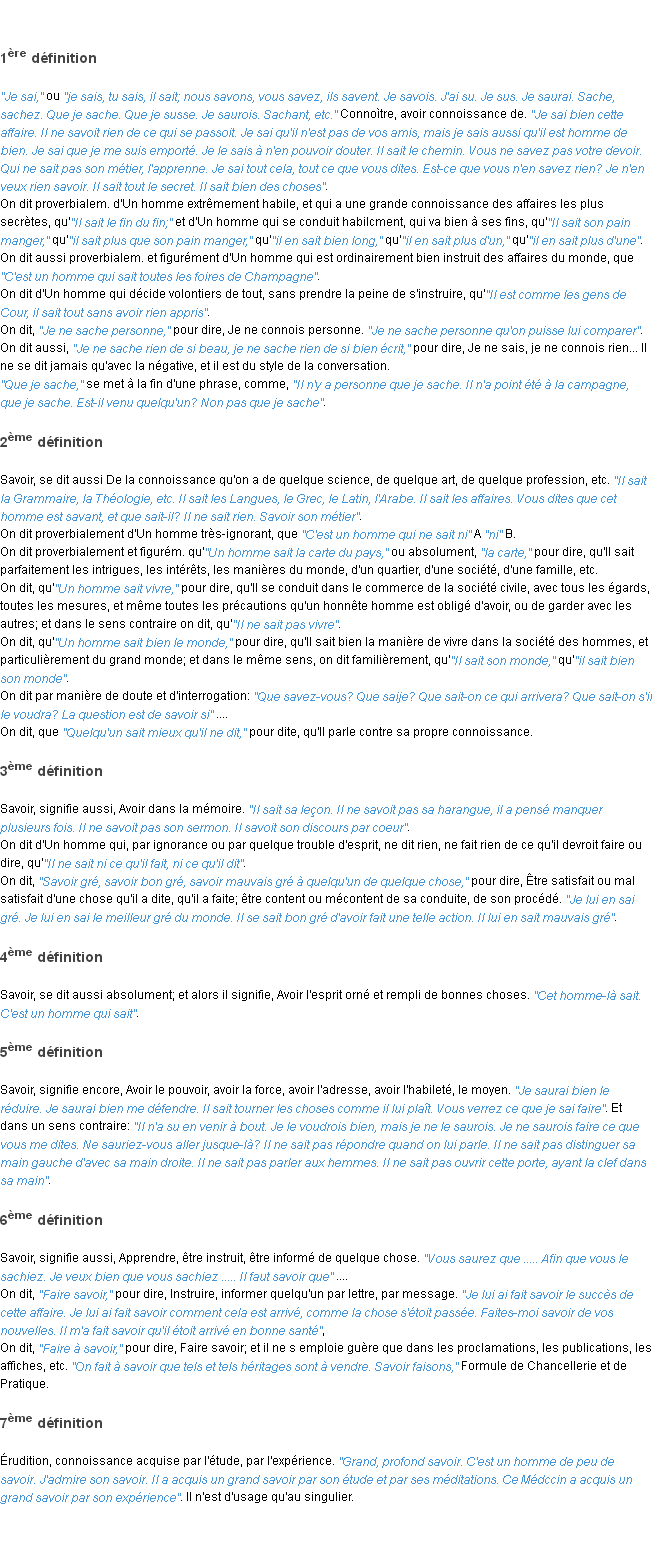 Signification du terme « savoir », parution de 1932, dictionnaire académique Français.