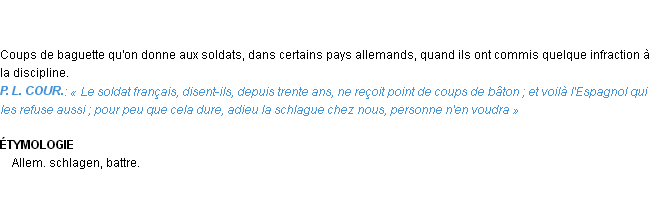 Définition de « schlague » issue du Littré (Auteur Emile Littré, édité en 1876).Merci à Olivie et Inès pour la numérisation du mot schlague.