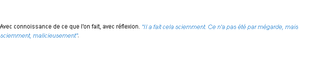 Définition du mot « sciemment » par l’équipe de la-definition.fr (édition de 2011).Merci à Flavie et Faustine pour la numérisation du mot sciemment.