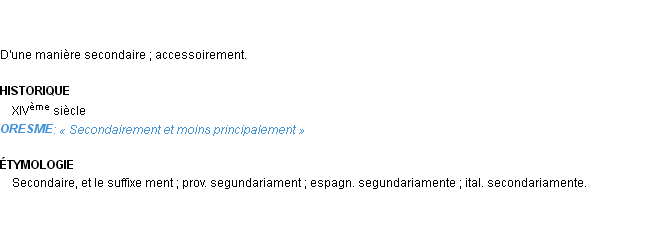 Signification du terme « secondairement », parution de 1876 (dictionnaire le Littré).Merci à Désiré et Adélaïde pour la numérisation du mot secondairement.