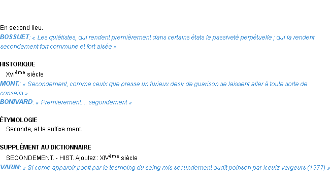 Définition développée dans dictionnaire d’Emile Littré (ancienne édition de 1876).Merci à Paschal et Nadine pour la numérisation du mot secondement.