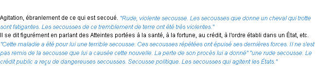 Définition du mot « secousse » par l’équipe de la-definition.fr (édition de 2011).Merci à Henri et Lionel pour la numérisation du mot secousse.