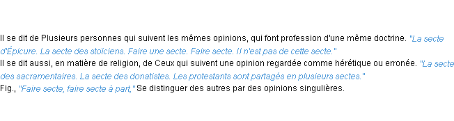 Signification éditée en 2010 par l’équipe de la-definition.fr.Merci à Alain et Clementine pour la numérisation du mot secte.