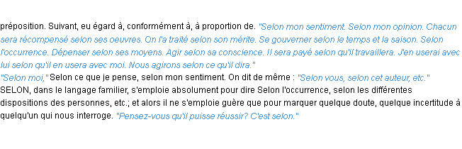 Ancienne signification éditée en 1798 pour le terme « selon » par l’Académie Française.