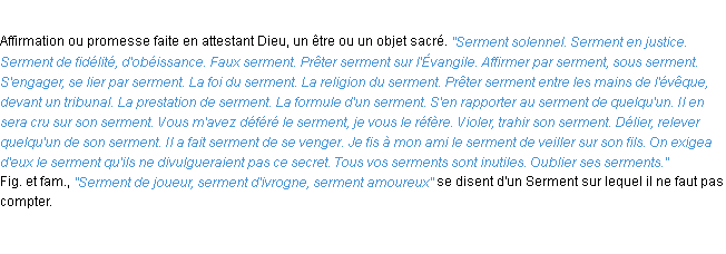 Signification éditée en 2010 par l’équipe de la-definition.fr.Merci à édouard et Basile pour la numérisation du mot serment.