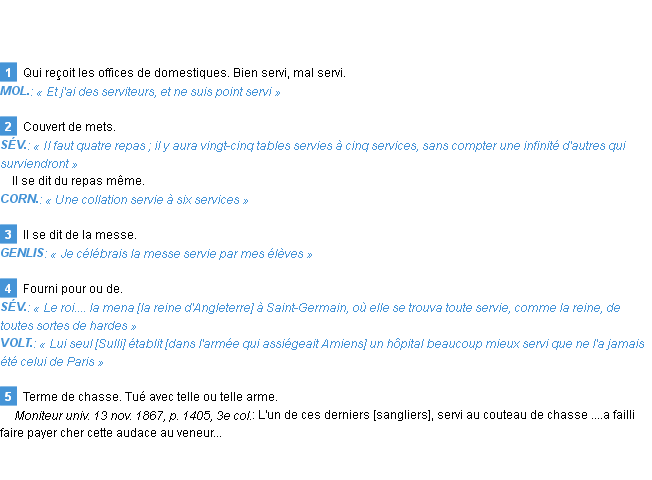 Définition du mot « servi » par Emile Littré (édition de 1876).Merci à Arienne et Josiane pour la numérisation du mot servi.