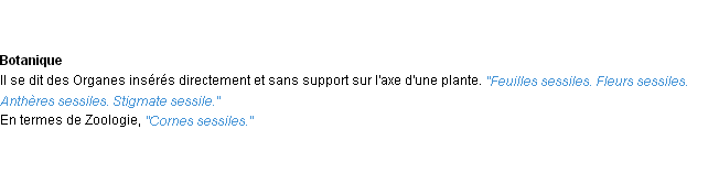 Signification développée en 1876 par Mr Littré (dictionnaire dit d’Emile Littré).Merci à Céline et Adrien pour la numérisation du mot sessile.