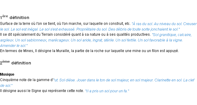 Signification éditée en 2010 par l’équipe de la-definition.fr.Merci à Gervais et Claire pour la numérisation du mot sol.