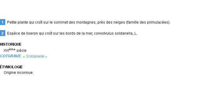 Définition de « soldanelle » de source académique (Académie Française, parution de 1932).