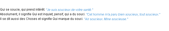 Définition de l’équipe de la-definition.fr (édition de 2009) pour le mot « soucieux ».Merci à Gisèle et Stéphanie pour la numérisation du mot soucieux.