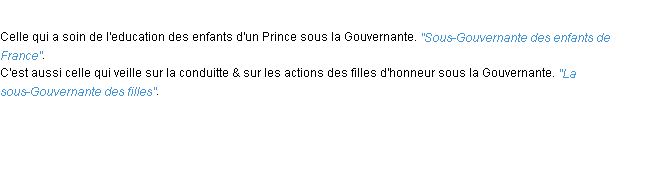 Ancienne définition de l’Académie Française (édition de 1694) pour le mot « sous-gouvernante ».Merci à Henri et Delphine pour la numérisation du mot sous-gouvernante.