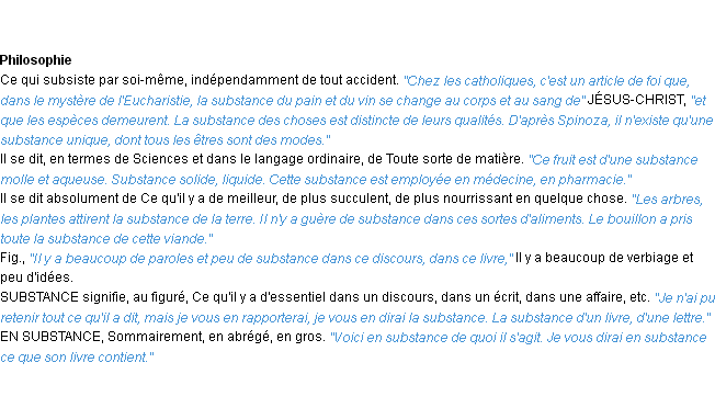 Ancienne signification éditée en 1835 pour le terme « substance » par l’Académie Française.