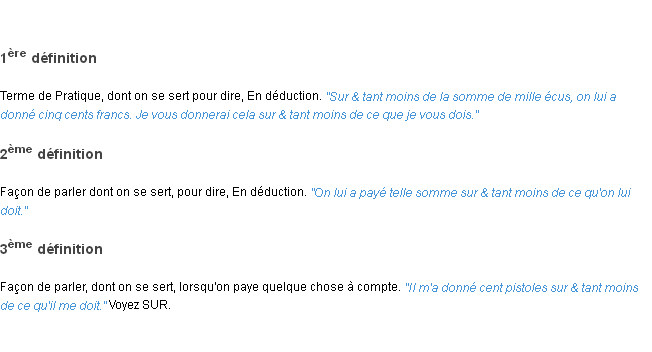 Ancienne signification éditée en 1694 pour le terme « sur et tant moins » par l’Académie Française.Merci à Mireille et Florianne pour la numérisation du mot sur et tant moins.