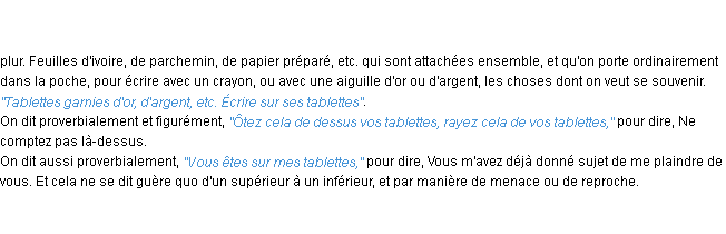 Ancienne définition du mot « tablettes » par l’Académie Française (édition de 17962).