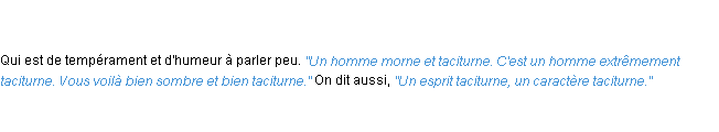 Signification parue en 2009 (source la-definition.fr).Merci à Cyrille et Philippe pour la numérisation du mot taciturne.