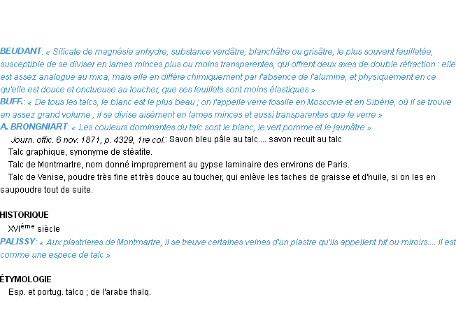 Signification éditée en 1876 pour le terme « talc » par Emile Littré.Merci à Sandrine et Josiane pour la numérisation du mot talc.