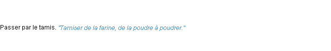 Signification éditée en 2010 par l’équipe de la-definition.fr.Merci à Barthélémy et Theirn pour la numérisation du mot tamiser.