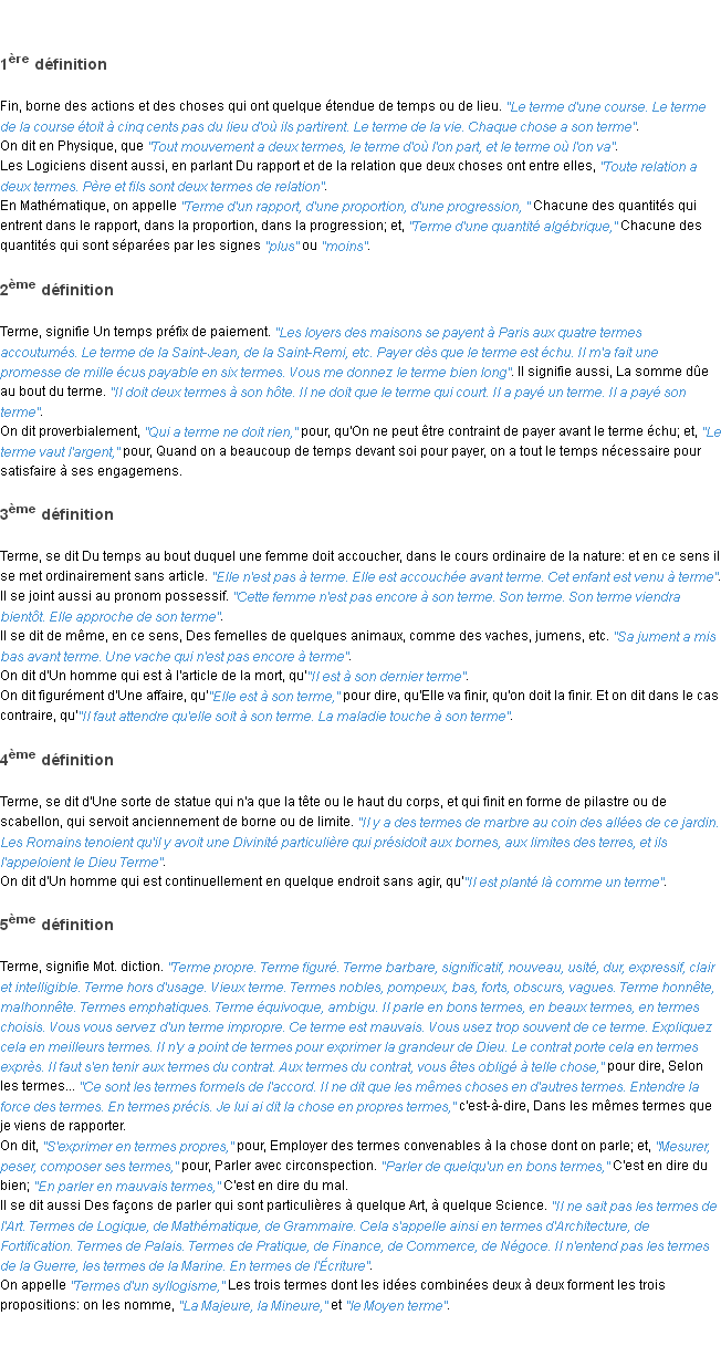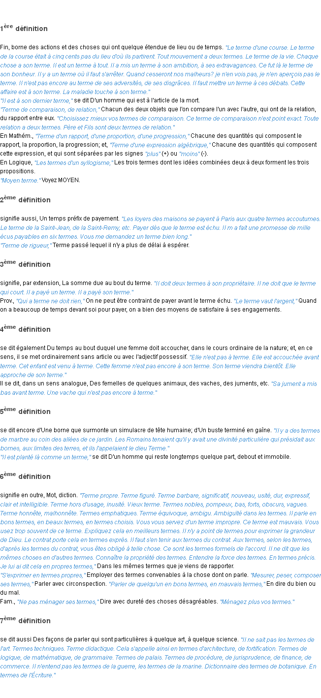 Ancienne signification éditée en 17962 pour le terme « terme » par l’Académie Française.Merci à Jean-marie et Arnaude pour la numérisation du mot terme.