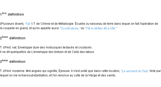Définition du mot « test » par l’équipe de la-definition.fr (édition de 2011).Merci à Aude et Désiré pour la numérisation du mot test.